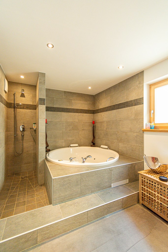 On the lower floor you’ll find the laundry room that you might use during your stay and our spacious wellness area. The wellness area boasts a spacious sauna, whirlpool, shower and daybeds. There is also another full bathroom with shower on this floor.