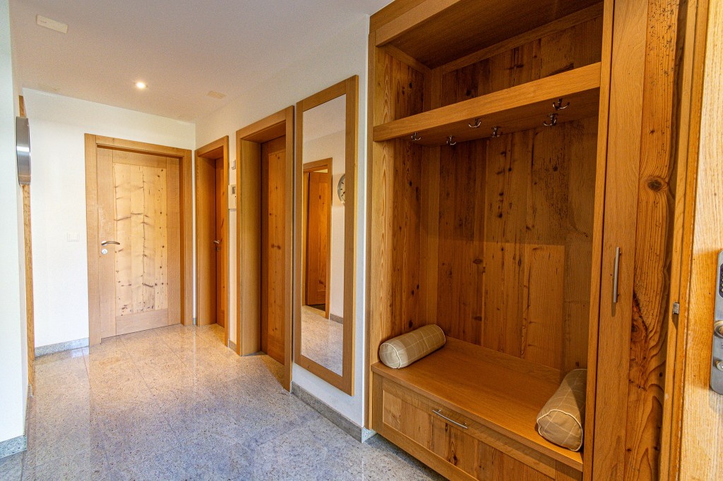 You’ll enter the chalet in a spacious hallway, you’ll find the private ski room to the left with separate outdoor access and from the hallway. Moving further inside, there are 3 bedrooms and 1 full bathroom with shower on this floor.