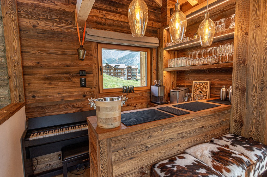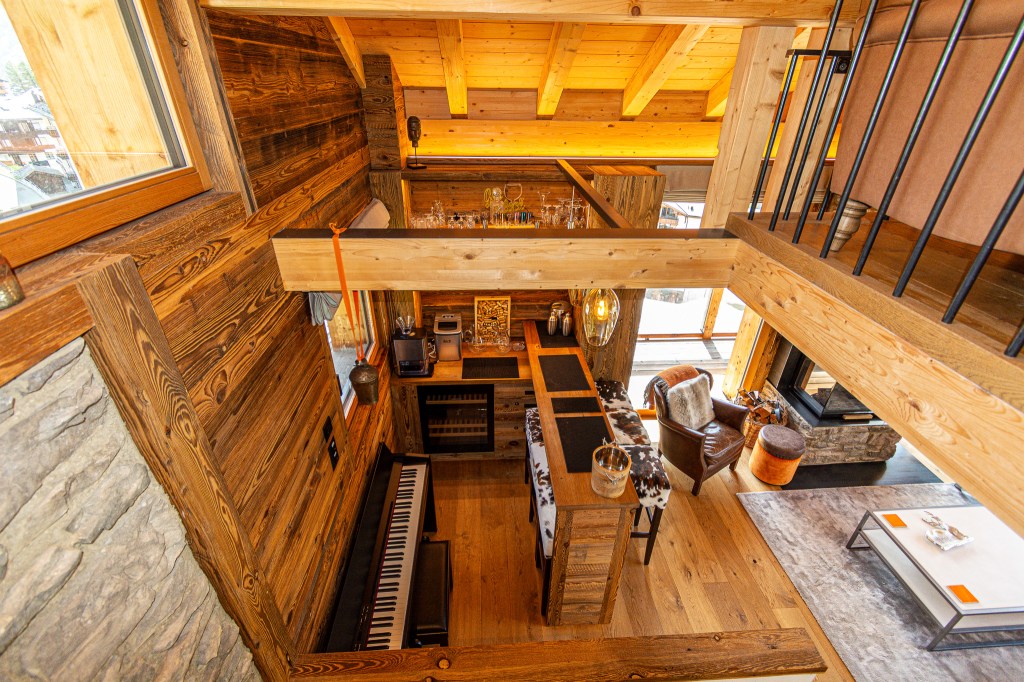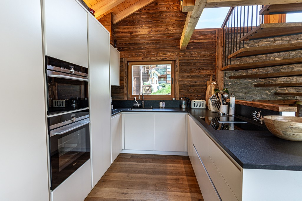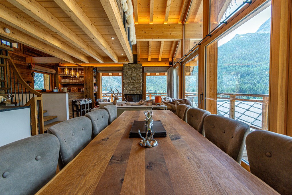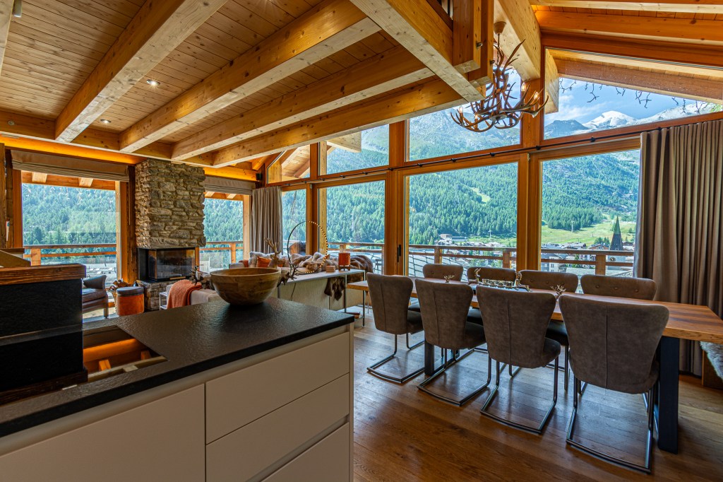 The top floor is the chalet’s statement space: a refined lounge with fireplace, a sleek bar area, and a fully equipped kitchen flowing into a generous dining area. Ideal for long, unhurried evenings after the hiking or skiing.