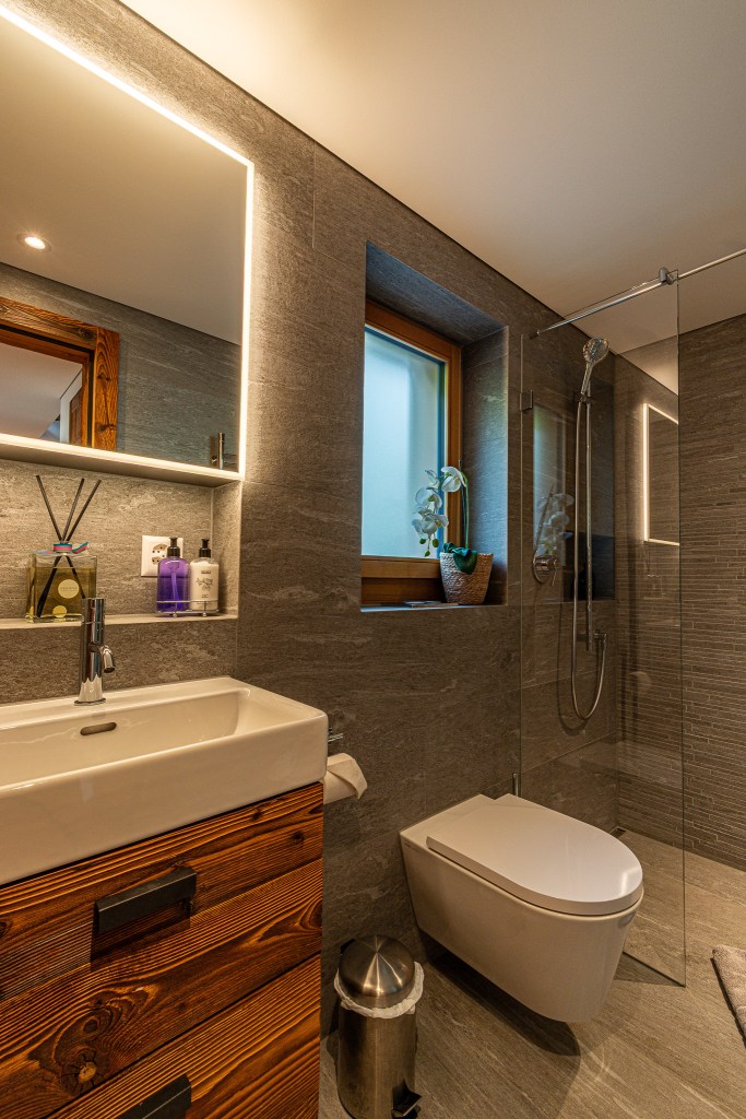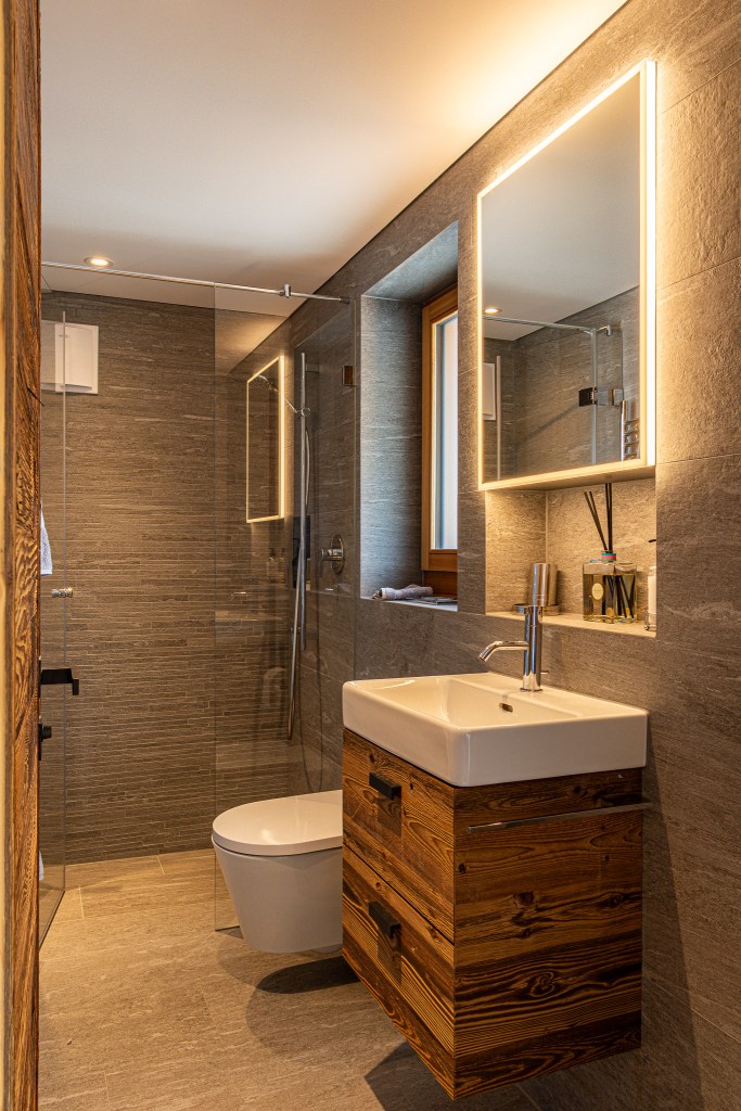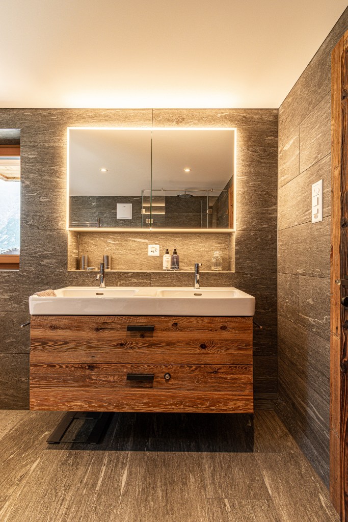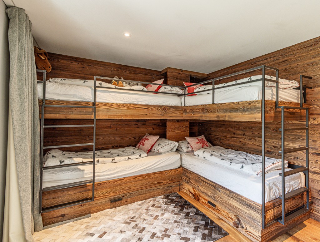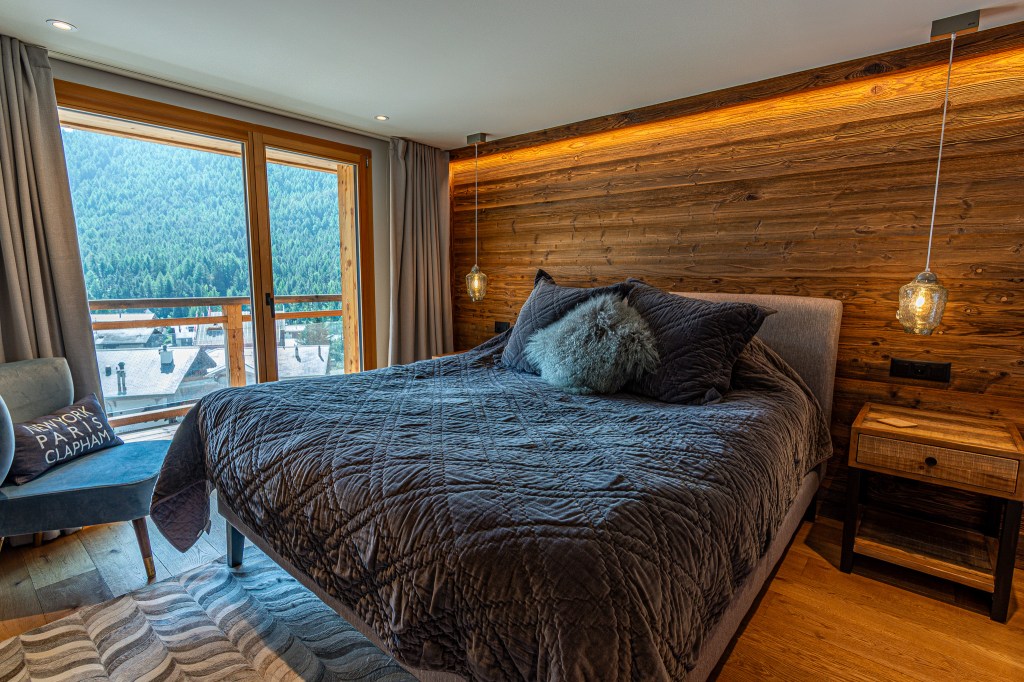 The top floor is the chalet’s statement space: a refined lounge with fireplace, a sleek bar area, and a fully equipped kitchen flowing into a generous dining area. Ideal for long, unhurried evenings after the hiking or skiing.