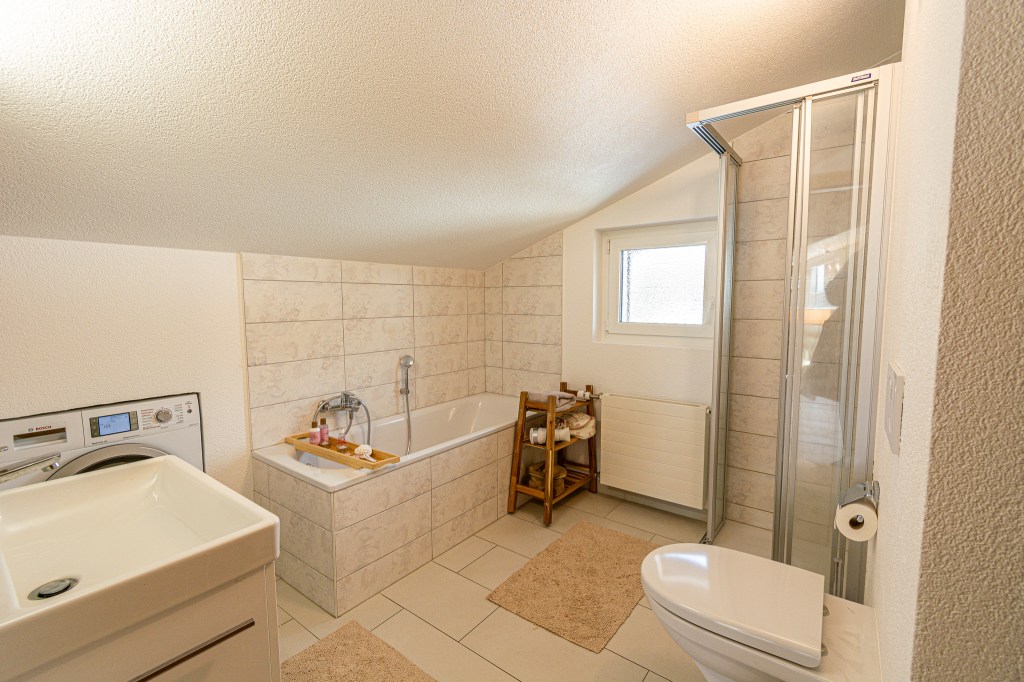 The bathroom boasts a shower, toilet, bath and a washing machine that you may use during your stay.