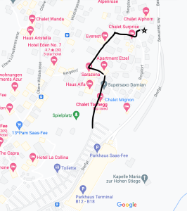 Saas-Fee is a wonderful Alpin village with the freshest air possible and we like to keep it that way. Being well known all around the world for it’s efforts in sustainability, and among many other things, it is car free. If you travel to Saas-Fee by car, you will first enter a large parking garage where you can unpack and leave your car. From there the local Taxi can pick you up with their electric quite funny looking cars. We advice you to first park in the designated unloading area, call the taxi and tell them the terminal & number you are parked at. While waiting for the taxi you can unload and park down in the multistorey garage. After a short drive of not more than 5 minutes you will reach the apartment.